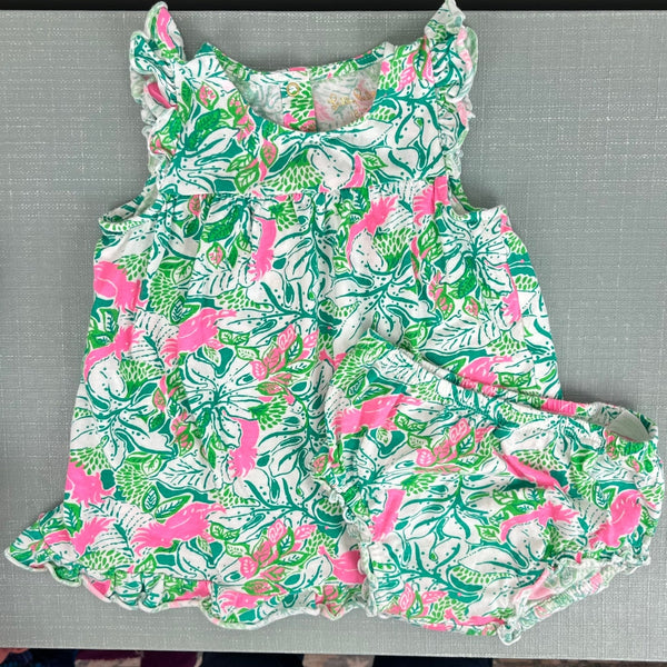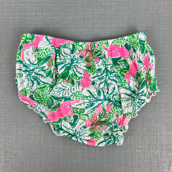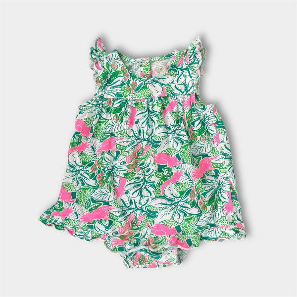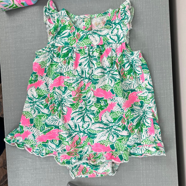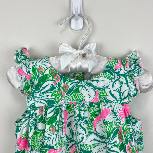 Lilly Pulitzer Girls Cecily Infant Dress Botanical Green Just Wing It. Baby toddler girl size 18-24 months. Cozy cotton jersey dress with ruffles at the sleeves and skirt. Includes matching bloomers diaper cover. Fun tropical print with green leaves and pink birds. Excellent condition!