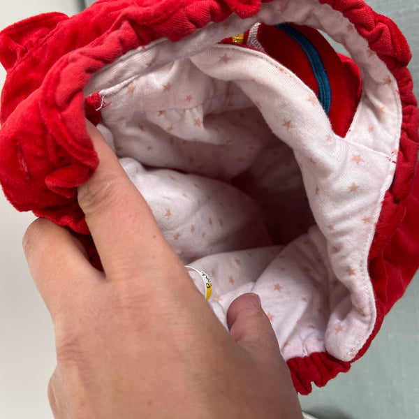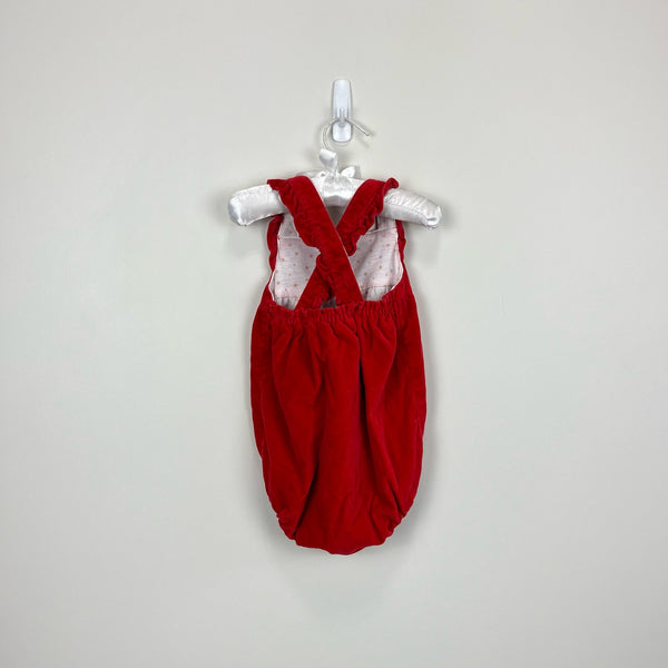 Mini Boden Polish Red Velvet Rocking Horse Romper. Baby toddler girl size 18-24 months. Festive red one piece bubble overalls outfit. Features adjustable button ruffle straps, soft star print lining, embroidered rocking horse on the bib, and snaps at the bottom. Excellent condition. Perfect for Christmas!