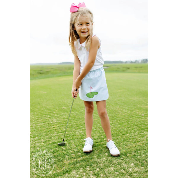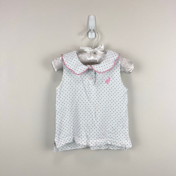 The Beaufort Bonnet Company Paige's Playful Tank Top Polo Barbados Blue Micro Dot with Hamptons Hot Pink. Baby toddler girl size 18-24 months. Super soft pima cotton sleeveless shirt. White with light blue polka dots and pink logo and trim. (Called "hot pink" but is really pastel as shown in photos.)