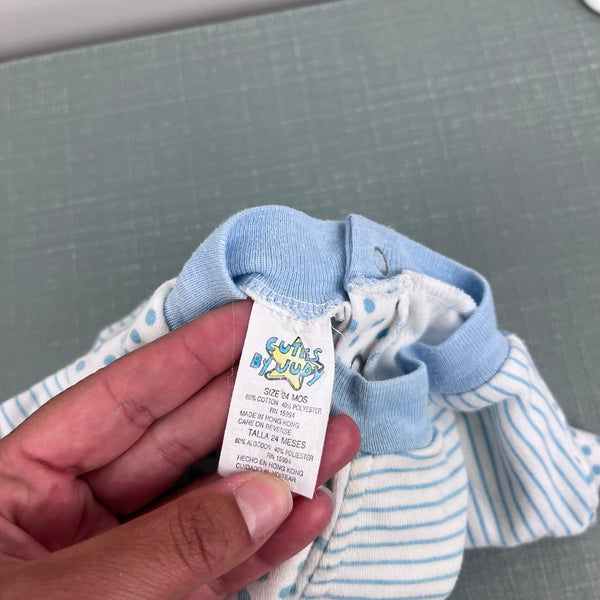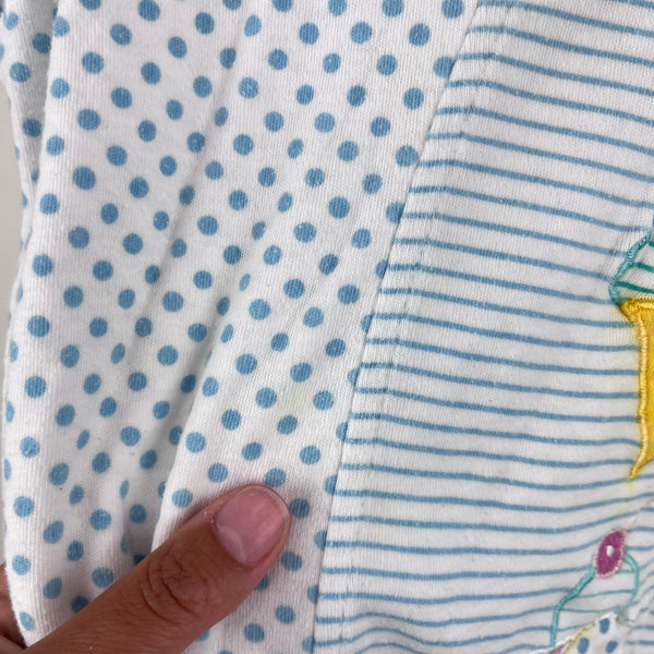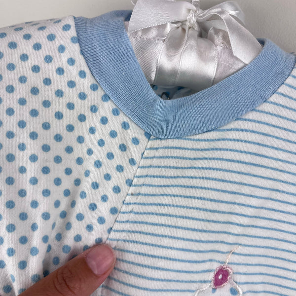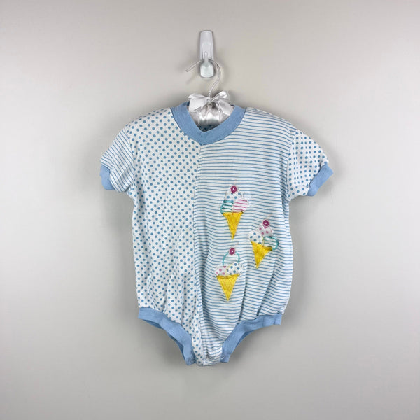 Vintage Cuties by Judy Polka Dot Stripe Applique Ice Cream Romper. Baby toddler girl size 24 Months. Adorable one piece sun suit outfit. Mixed light blue and white stripes and polka dots with colorful ice cream cones. Snaps on the bottom for easy on/off. Has some wear and light marks (see photos; untreated). Perfect for every day summer play!