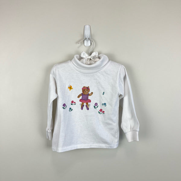 Vintage Spencers Ballet Bear Turtleneck Shirt. Baby toddler girl size 24 months. USA made. Casual long sleeve white top with a dancing ballerina teddy bear and flowers.