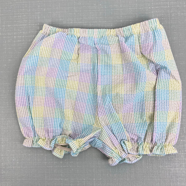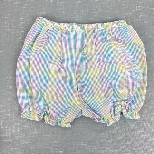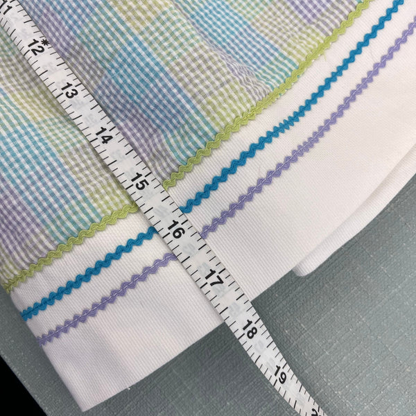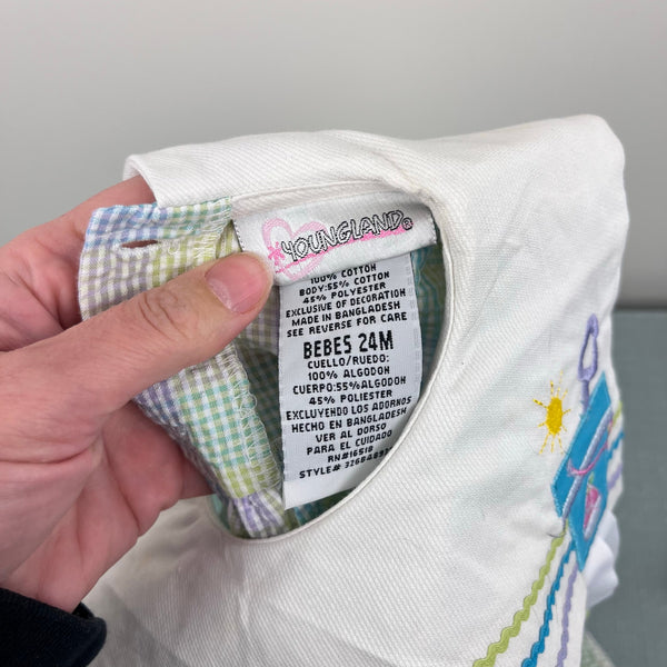 Vintage Y2K Youngland Pastel Seersucker Beach Dress. Baby toddler girl size 24 months. Dead stock, brand new with tags (NWT), though has assorted light marks from storage and will need a wash before first wear (see photos; untreated). Colorful plaid dress with matching diaper cover bloomers. Square white bib collar with green, blue, and purple ric rac ribbon and embroidered pail, sun, and sailboat. Fun flip flip tassels, too! Perfect for a summer party!