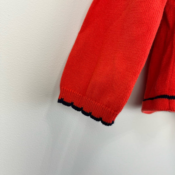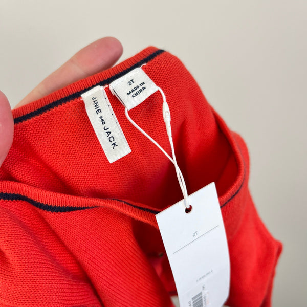 Janie and Jack Girls Ruffle Cardigan Sweater. Toddler girl size 2T. Brand new with tag (NWT). Bright red cardigan sweater with navy trim at collar, cuffs, and shoulder ruffles.