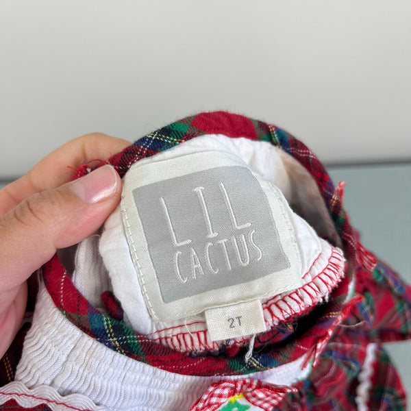 Lil Cactus Smocked Plaid Christmas Tree Dress. Toddler girl size 2T. Festive holiday plaid pattern with embroidered Christmas trees and plaid fabric bows at the beck. Fun ric rac ribbon detail on the flutter sleeves and skirt. Buttons in the back for easy on/off.