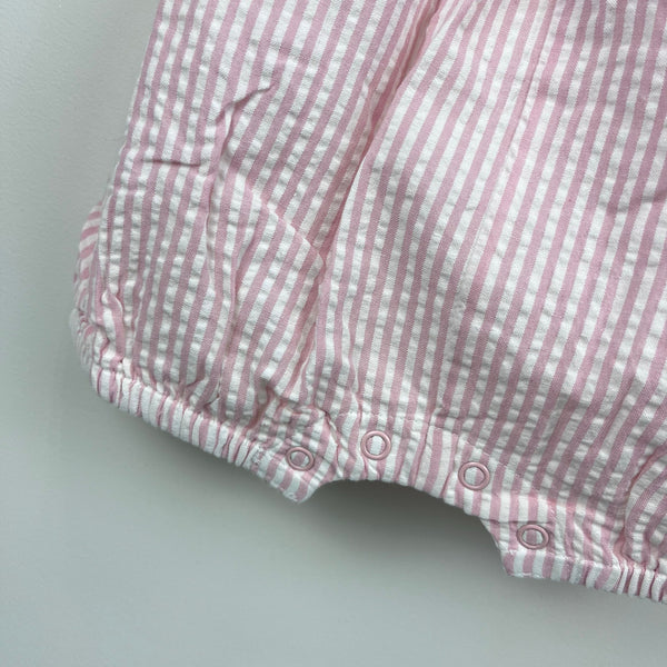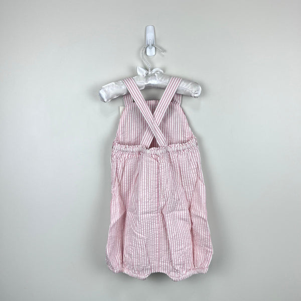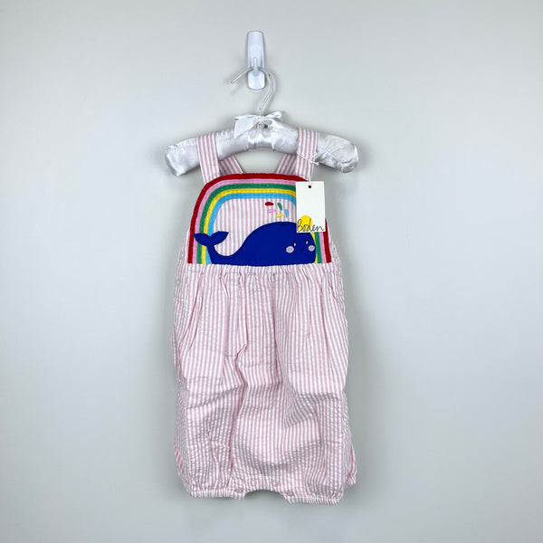 Mini Boden Appliqué Whale Woven Romper Ivory/Pink Ticking Whale. Toddler girl size 2-3 years. Brand new with tag (NWT), in bag. Pink and white seersucker striped shortall sunsuit outfit. Features adjustable button straps, elasticized waist, lined bottom, buttons at the side, and snaps at the legs. Adorable bib design with a rainbow and whale.