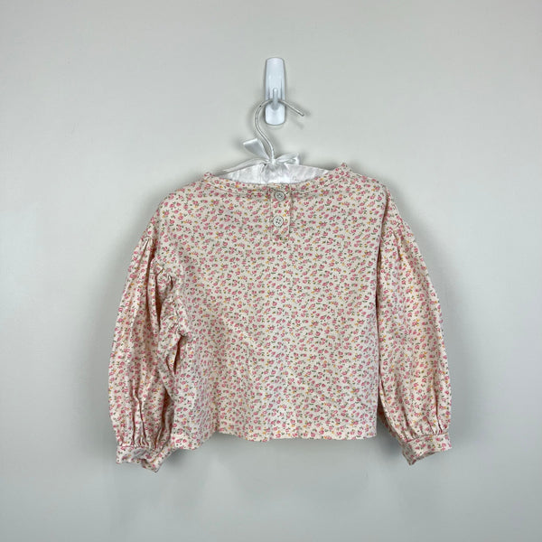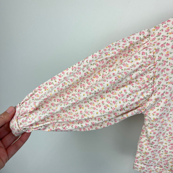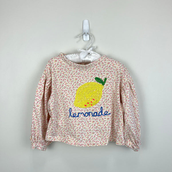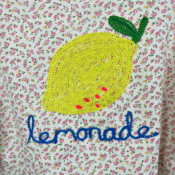 Mini Boden Embroidered Top Ivory Floral Lemonade. Toddler girl size 2-3 years. Long sleeve relaxed fit shirt with drop shoulders and puff sleeves. Buttons in the back. Pretty pink flower print and fun embroidered lemon on the chest. Tiny spots (I think sticker residue) on the lemon, but otherwise great condition!
