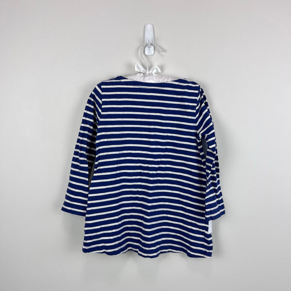 Mini Boden Zebra Applique Pocket Tunic Dress. Toddler girl size 2-3 years. Long sleeve navy blue and white striped tunic dress with fun rainbow applique zebra pockets. Buttons on the shoulder for easy on/off. Great condition with no flaws noted.