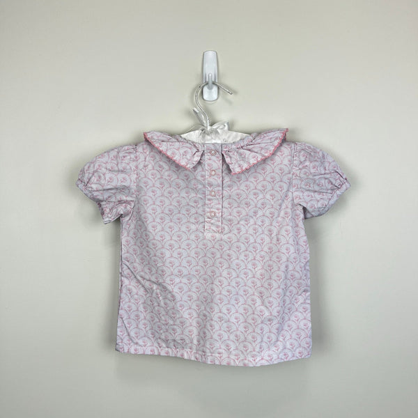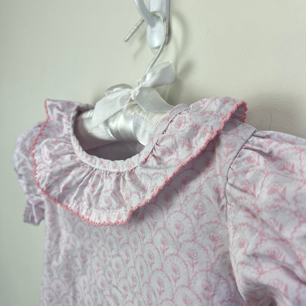 Southern Smocked Co Short Sleeve Pink Floral Ruffle Blouse. Toddler girl size 24 months/2T. Short sleeve top with ruffle collar and snaps in the back. Pretty flower design.