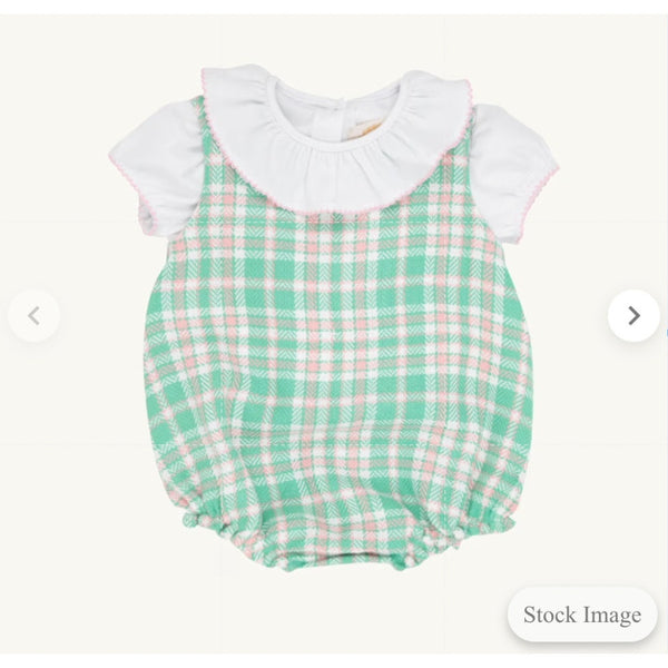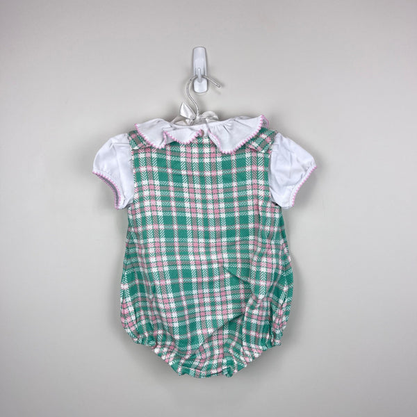 The Beaufort Bonnet Company Brooksy Bubble Set Putney Plaid with Worth Avenue White & Palm Beach Pink Picot. Toddler girl size 2T. Brand new with tag, in bag (NWT) and would make a great gift! Match for little sister (6-12 months) available separately. (Also have a size 8 skirt that can be listed upon request.) Adorable dressy two piece romper outfit set Super soft pink, green, and white plaid bubble and matching ruffle collar white short sleeve top. Elasticized leg openings, snaps at the bottom, and buttons at the shoulders.