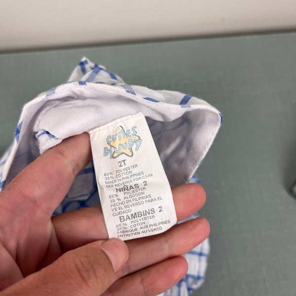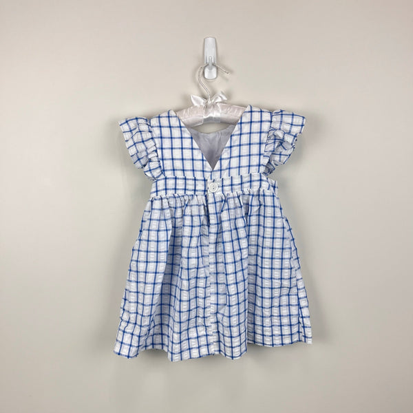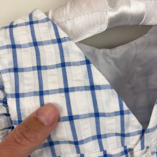 Vintage Cuties by Judy Blue Plaid Strawberry Dress. Toddler girl size 2T. Sleeveless blue and white windowpane plaid dress with ruffles on the shoulders. Buttons in the back and adorable design with strawberries on the chest. Tiny spot in the back (see last photo; untreated), but otherwise great condition. So cute for summer!