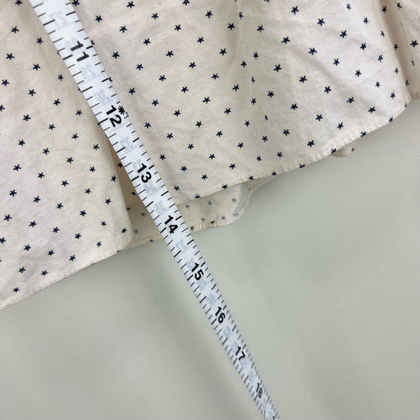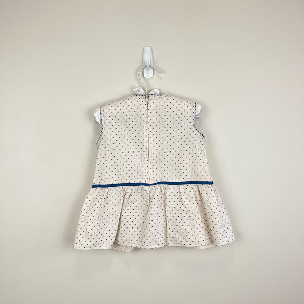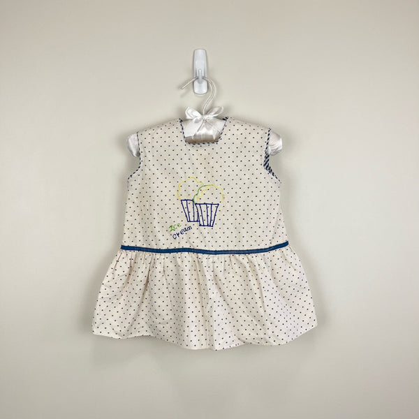 Vintage Polka Dot Star Ice Cream Dress. No tags, so please check measurements to ensure fit. (I'd guess about 18 months as a dress, but you could definitely wear as a top, too as your kiddo grows!). Sleeveless white dress wit navy blue stars and embroidered ice cream cones on the chest. Zipper in the back. Has a few light marks and a loose thread in the ice cream (see photos).