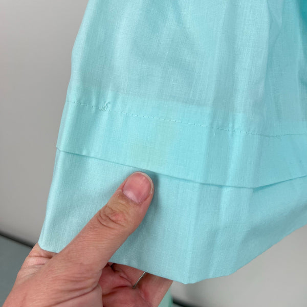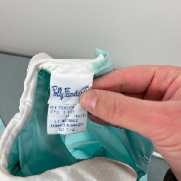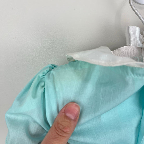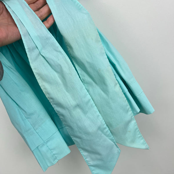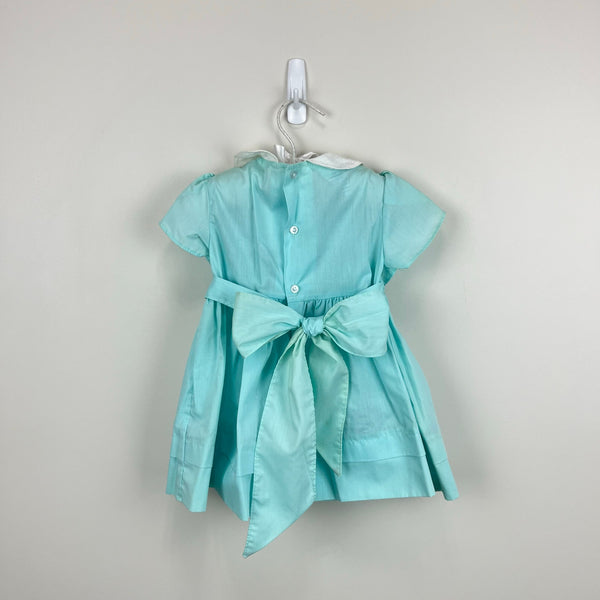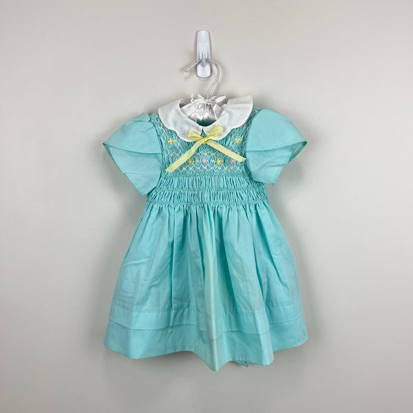 Vintage Polly Flinders Smocked Smocked Aqua Dress. Toddler girl size 2T. Pretty blue green color. White petal collar with layered short sleeves. Smocking across the chest with embroidered flowers and yellow ribbon bow. Buttons and a sash to tie a bow in the back. Has assorted light marks (see photos; untreated). Perfect for Easter!