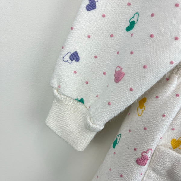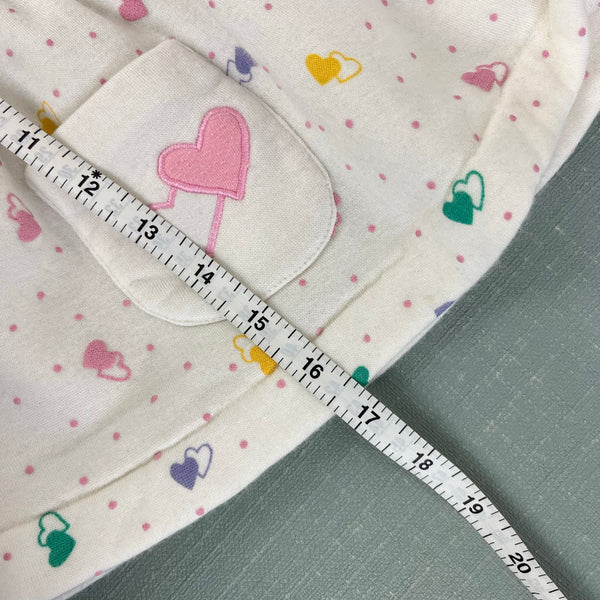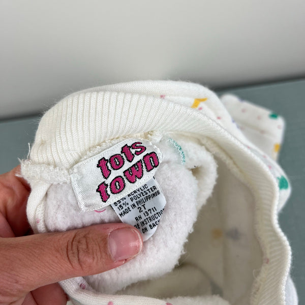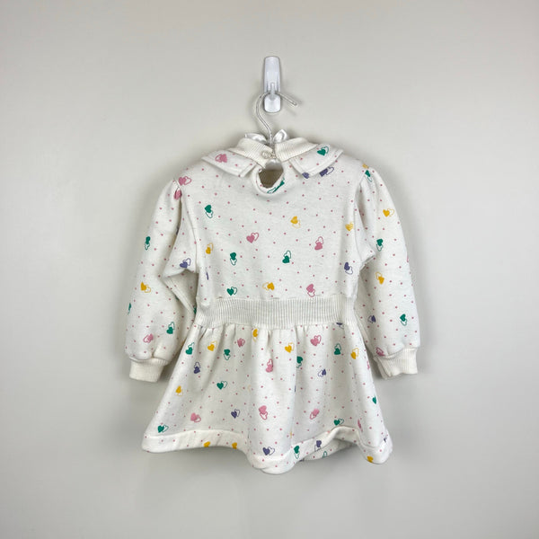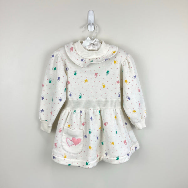 Vintage Tots Town Polka Dot Heart Ruffle Sweatshirt Dress. Toddler girl size 2T. Cozy long sleeve white dress with pastel pink dots and colorful hearts. Features a ruffle collar and patch pocket. Keyhole button back. Faint mark (see last photo; untreated) and elastic button loop is worn out, but otherwise great condition!
