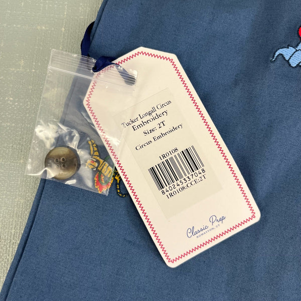 Classic Prep Childrenswear Tucker Longall Circus Embroidery. Toddler boy size 2T. Brand new with tag, in bag (NWT). Original retail $79. Classic long jon jon style overalls with buttons on the shoulders and snaps along the legs. Blue with embroidered circus tents, elephants, and lions. The cutest design ever!