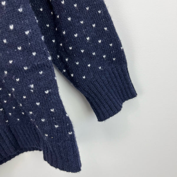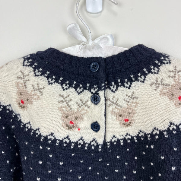 JoJo Maman Bebe Navy Fair Isle Reindeer Sweater. Toddler boy or girl size 2-3 years. Cozy lambswool blend crewneck sweater in navy blue with white dots and adorable red nose Rudolf reindeer faces around the neck. Buttons in the back for easy on/off. Perfect for Christmas!