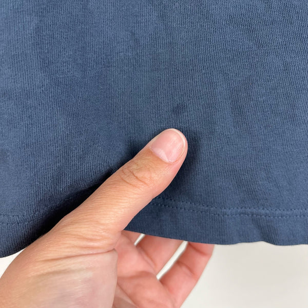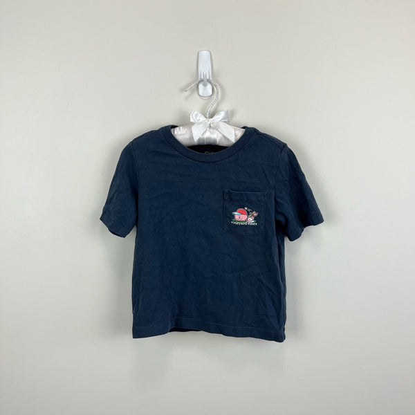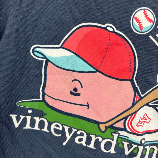 Vineyard Vines Boys' Baseball Whale Short-Sleeve Pocket T-Shirt. Toddler boy size 2T. Casual navy blue top with signature pink whale logo in baseball gear on the front pocket and back. Light wear to the graphic and faint mark (see last photo; untreated).