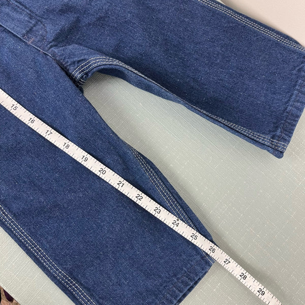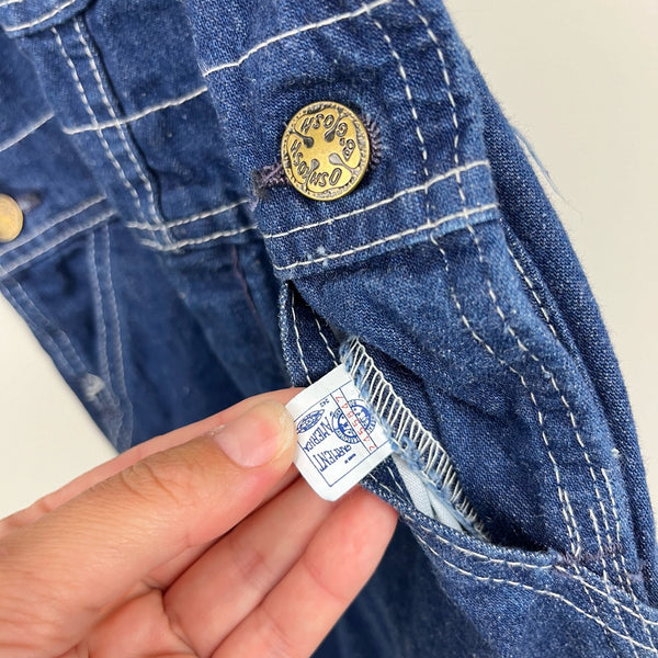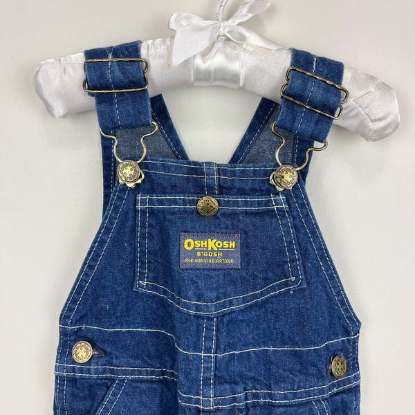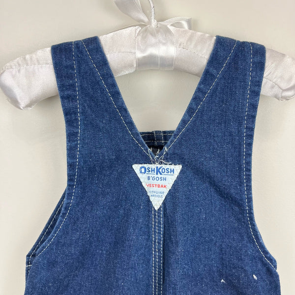Vintage OshKosh B'gosh Blue Jean Overalls. Made in the USA. I can't find the tag, but these looks like a girls or boy size 2T (see photos for measurements). Classic vestbak style denim overalls with adjustable straps. These are crisp and seem new without tags (NWOT; you can see the threads in the back where the store tag was removed).