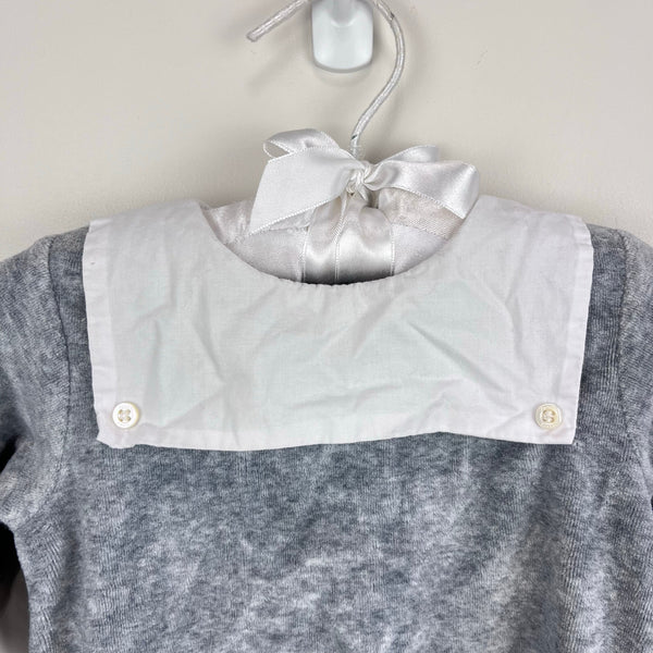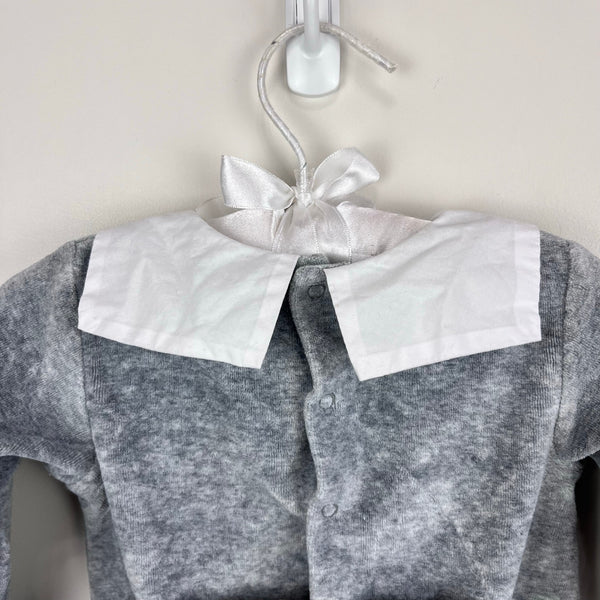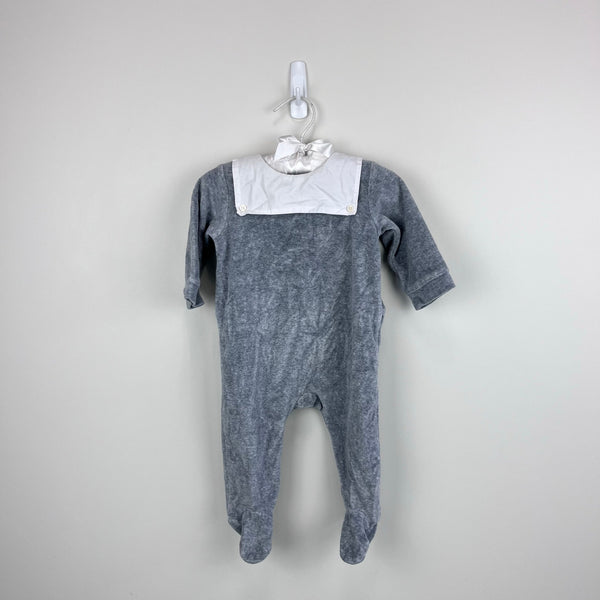 Jacadi Paris Gray Velour Footie. Baby boy size 6 months. One piece velvet pajamas outfit. Super soft and cozy. Grey with white collar. Snaps in the back. Covered feet.