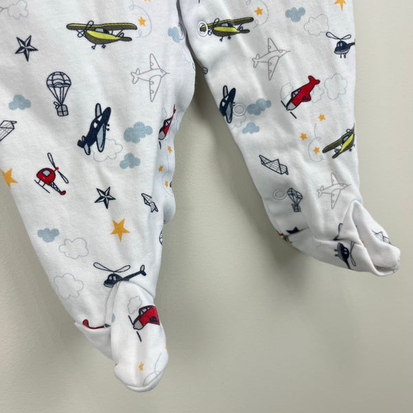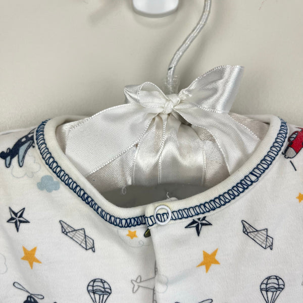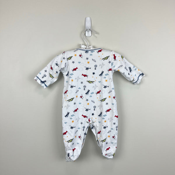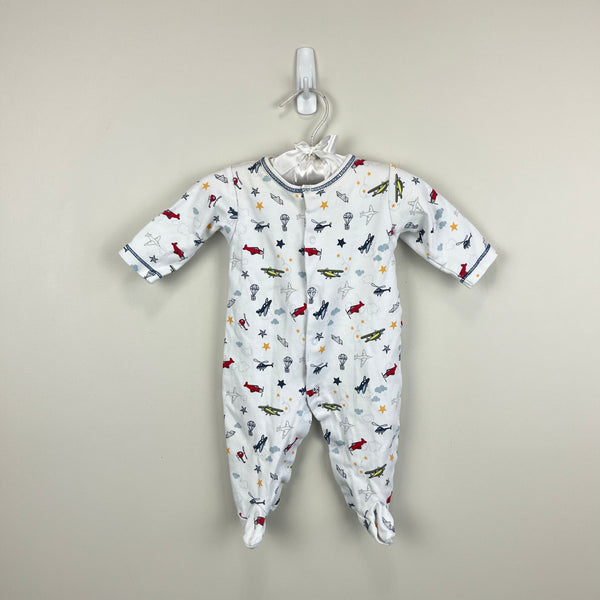 Kissy Kissy Aviation Footie Coverall. Baby boy size 3-6 months. Super soft pima cotton one piece outfit is perfect for sleep or play. White with blue, green, and red airplanes, helicopters, stars, hot air balloons, and more! Fold over mitten cuffs and snaps down the front. Maybe super faint discoloration by the neck, but overall great condition.