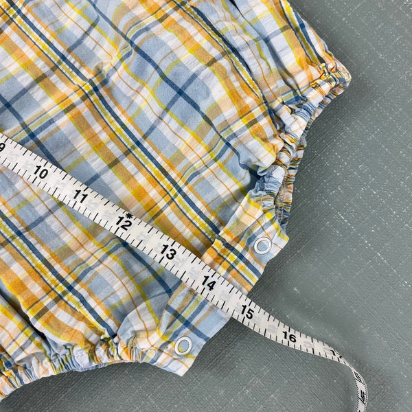 Le'ZaMe Smocked Plaid Sailboat Sunsuit Romper. Baby boy size 6 months. One piece shortall outfit. Blue and yellow plaid with smocking and embroidered sailboats across the chest. Buttons on the shoulder and snaps at the bottom. Perfect for summer!