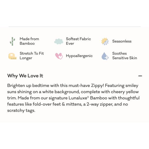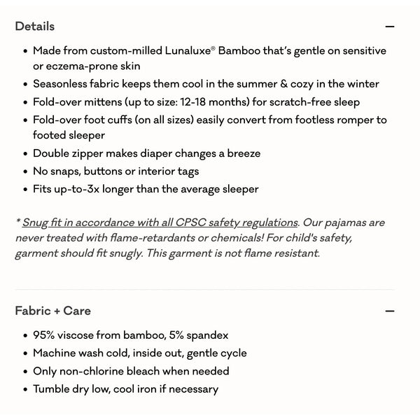 Features: Lunaluxe® Bamboo is gentle on sensitive or eczema-prone skin Seasonless fabric keeps cool in the summer & cozy in the winter Fold-over mittens for scratch-free sleep Fold-over foot cuffs to convert from footless romper to footed sleeper Double zipper for easy diaper changes Stretch to fit up-to-3x longer than the average sleeper No snaps, buttons or interior tags
