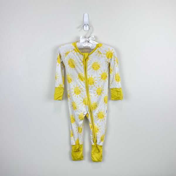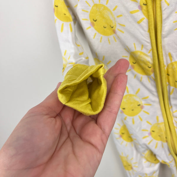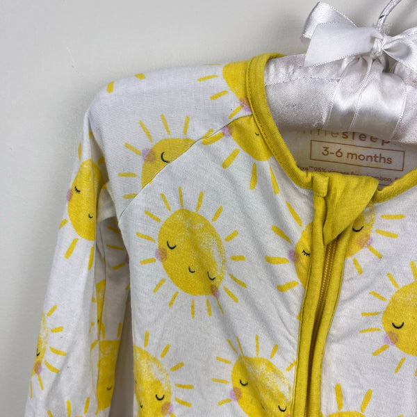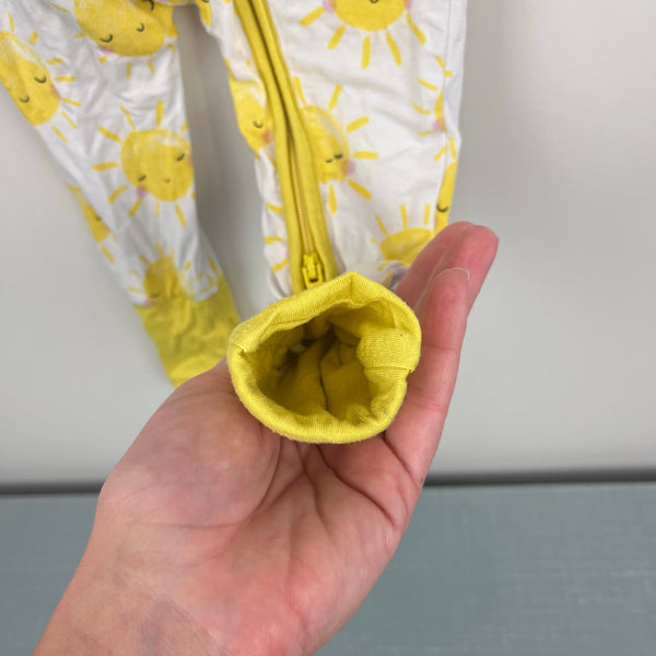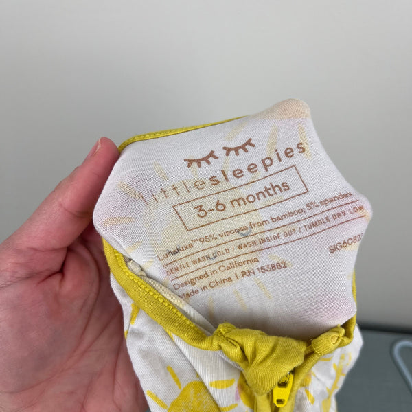 Little Sleepies Sunshine Zippy. Baby boy or girl size 3-6 months. Cute and cozy one piece coverall outfit for sleep or play. White with smiling yellow sun print. 95% viscose from bamboo; 5% spandex. Light wear.