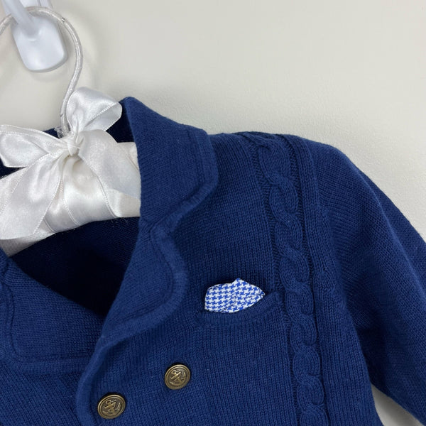 Mayoral Baby Navy Blue Cable Knit Cardigan. Baby boy size 6 months. Elegant blazer style sweater. Double breasted with gold ancho buttons and faux handkerchief in the breast pocket. Excellent condition.