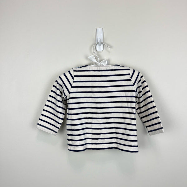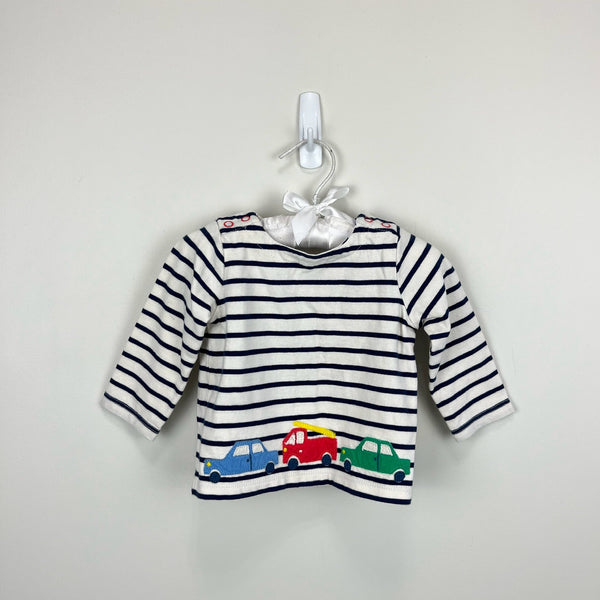 Mini Baby Boden Breton Stripe Applique Car T-Shirt. Baby boy size 3-6 months. Long sleeve top in navy blue and white stripes. Snaps on the shoulder for easy on/off. Fun blue, red, and green vehicle design.