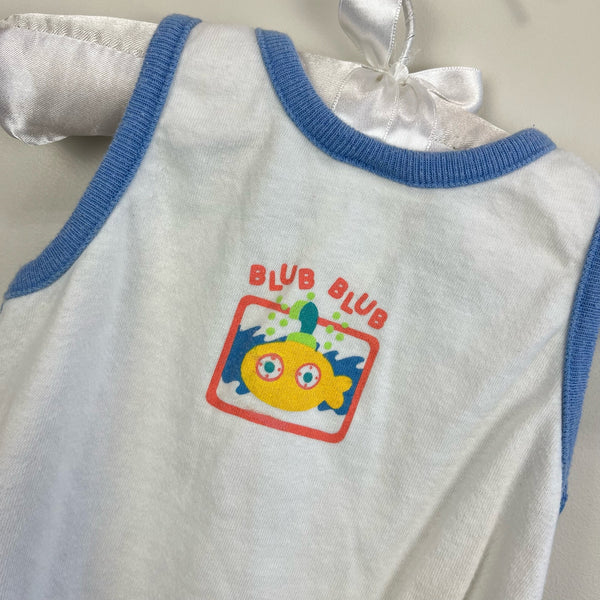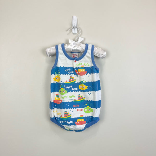 Vintage Buster Brown Ocean Bodysuit Romper. Baby boy size 6-9 months. Made in the USA. Fun one piece sun suit outfit for summer. Blue and white wave stripes with tug boats and submarines. Great condition!