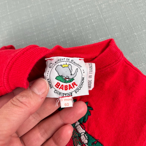 Vintage Laurent Brunhoff Babar T-Shirt. Baby boy or girl size 6 mois (months). Made in France Short sleeve red top featuring the famous French elephant Babar driving his car with his family.