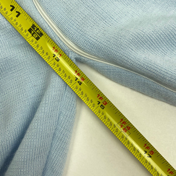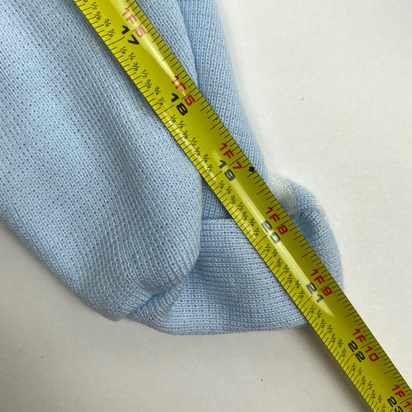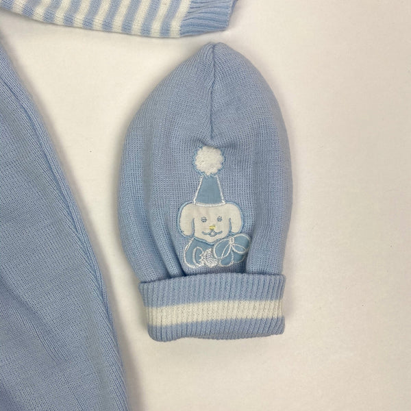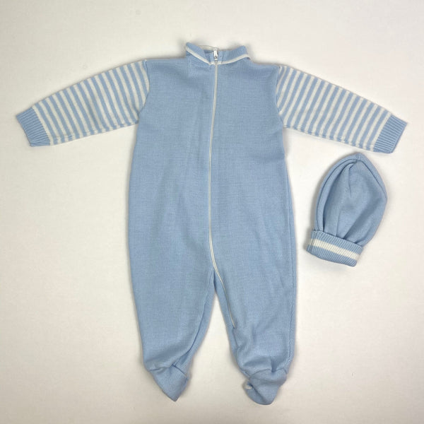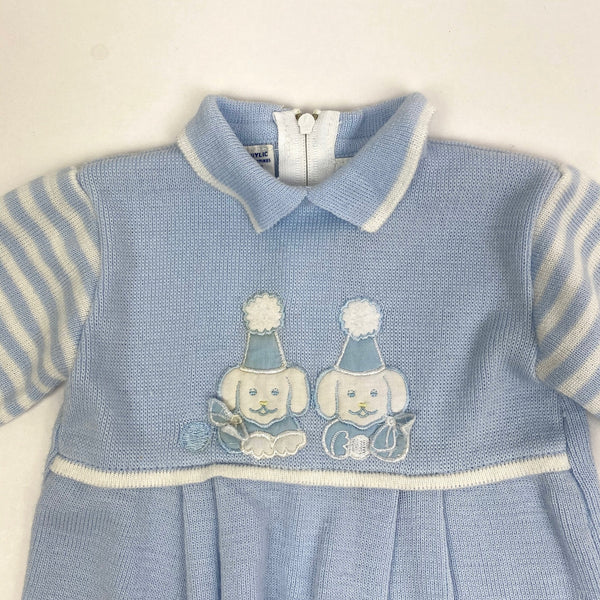 Vintage Peppermint Stick Baby Boy Party Puppies Coverall. No size, so please check measurements to ensure fit. Looks around 6 months. Knit light blue one piece. Collared with striped sleeves, covered feet, and zipper in the back. Adorable dogs in party hats. Matching hat! Faint mark (see last photo; untreated).