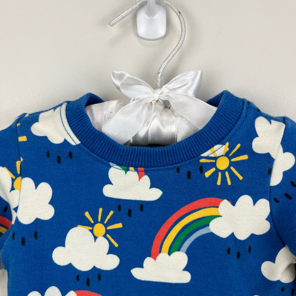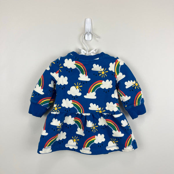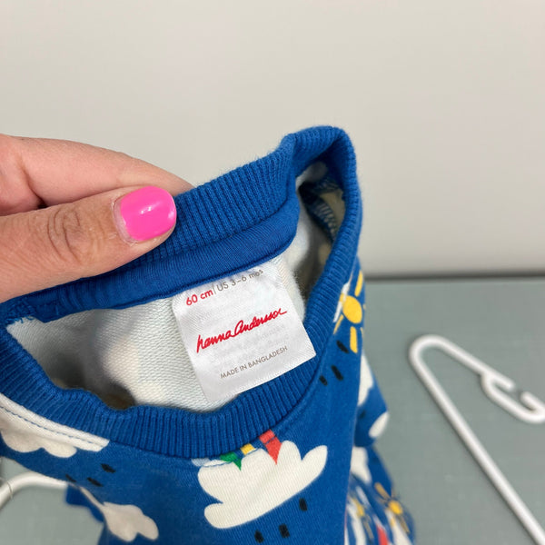 Hanna Andersson Baby Printed French Terry Dress Blue Rain or Shine. Baby girl size 60 cm (US 3-6 months). Cozy long sleeve dress with clouds, rainbows, and suns. Excellent condition with no flaws noted.