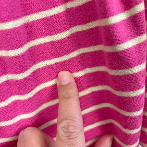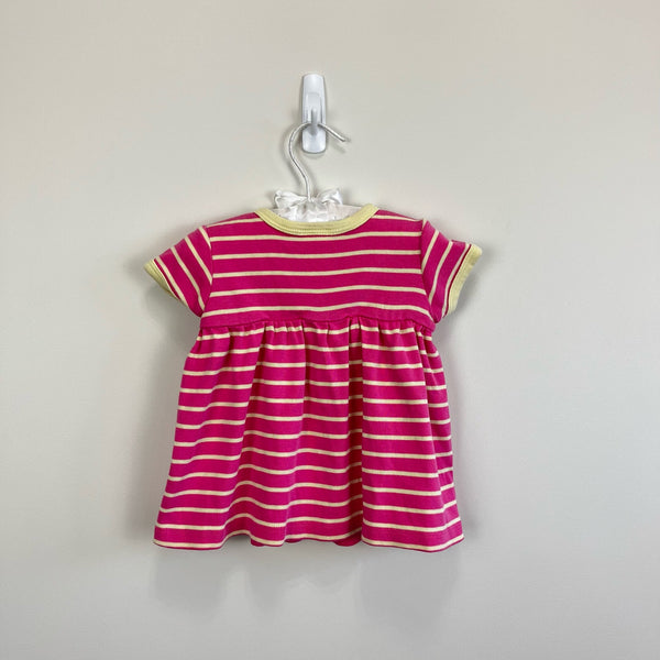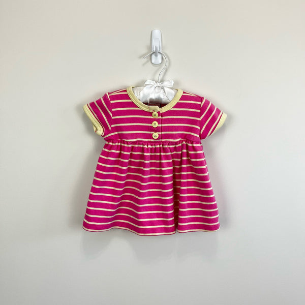 Hanna Andersson Short Sleeve Striped Dress. Baby girl size 60 cm (3-6 months). Cute and casual dress for every day play. Pink with yellow striped and buttons. Has a couple tiny pin holes/snags in one spot (see last photo), but no other flaws to note.