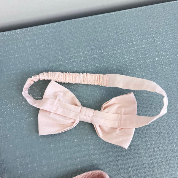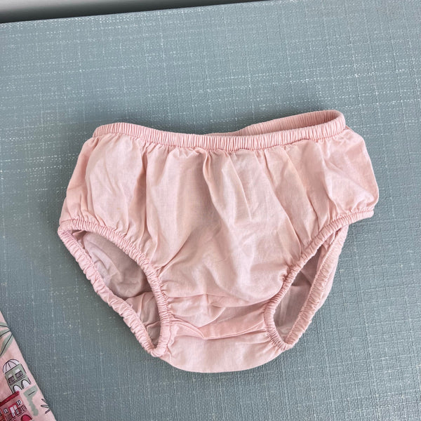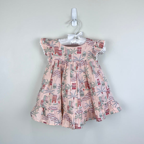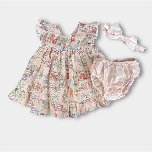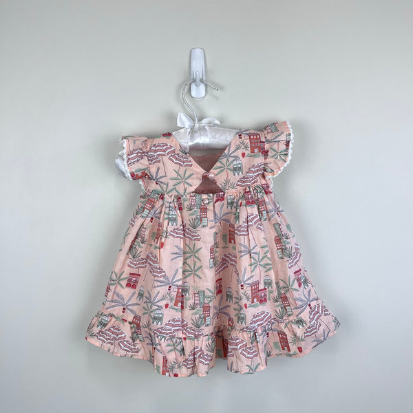 Janie and Jack Baby Coastal Getaway Dress & Soft Headband Pale Pink. Baby girl size 3-6 months. Outfit set includes short sleeve dress, diaper cover, and hair bow. Dress features flutter sleeves with crochet details, a ruffled hem, and cutout back. Scenic print includes palm trees, beach umbrellas, and buildings. Perfect for vacation! 100% Cotton Batiste. Fully Lined. Pearl button back. ($54) Includes matching classic bow headband with a soft elastic back for all-day comfort. ($16.50)