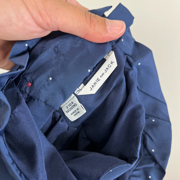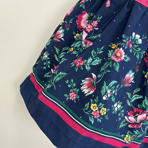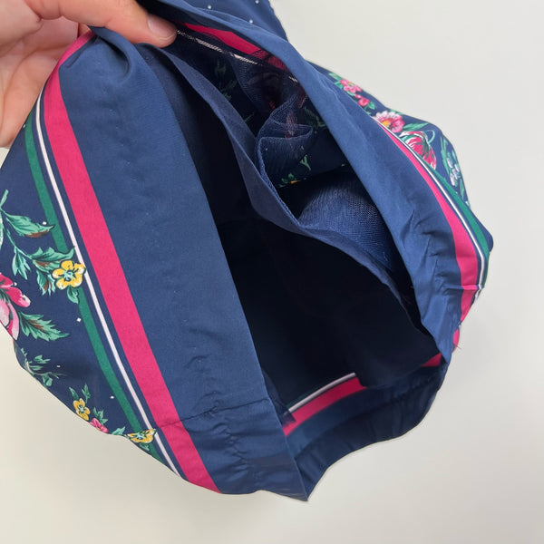 Janie and Jack Floral Border Dress. Baby girl size 3-6 months. Sleeveless merchant marine navy blue dress. Mixed prints with mini dots, flowers, and pink stripes. Features ruffle collar, tulle underlayers, and grosgrain ribbon at the waist. Excellent condition.