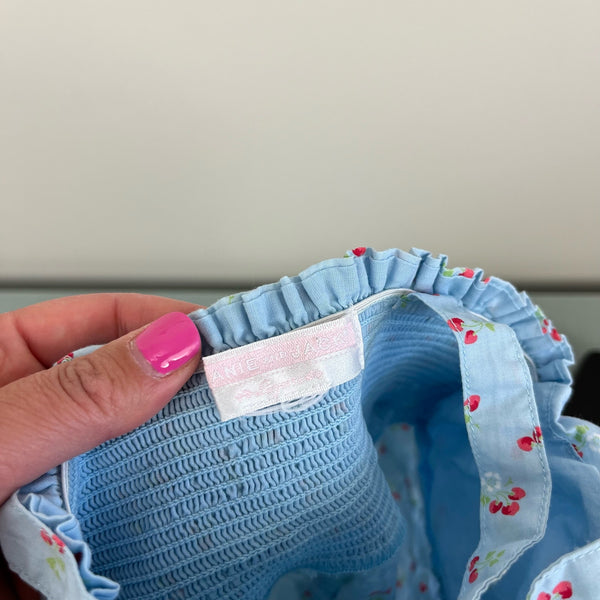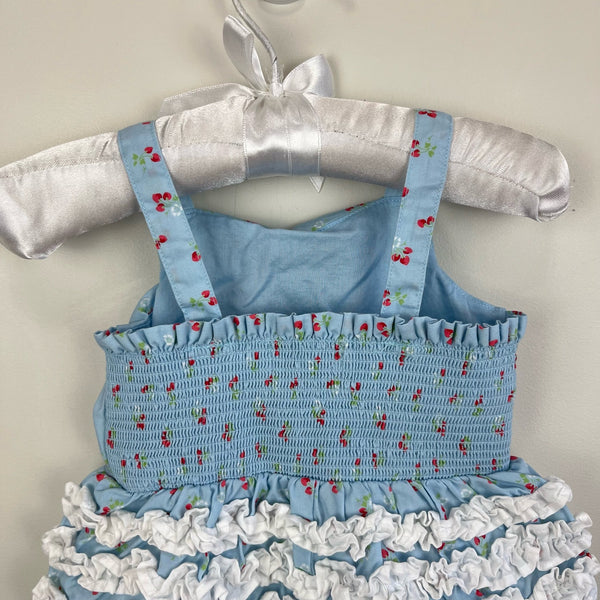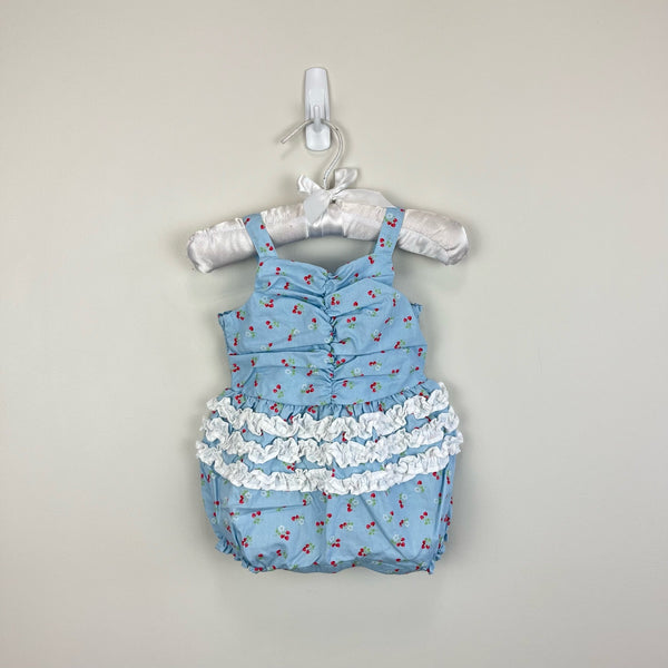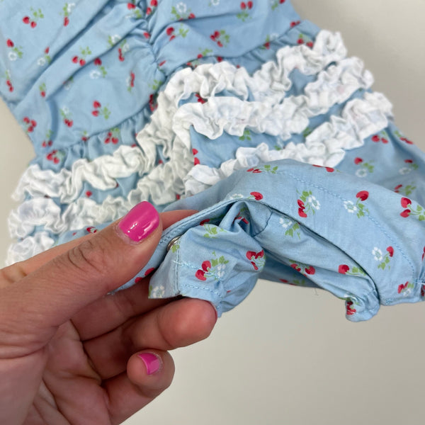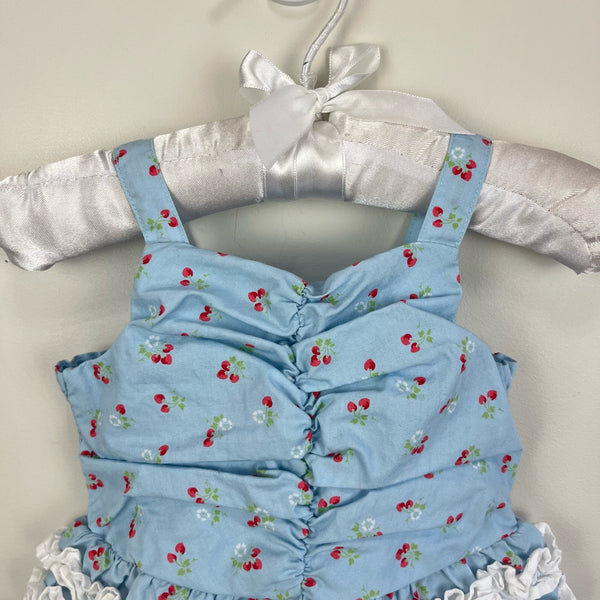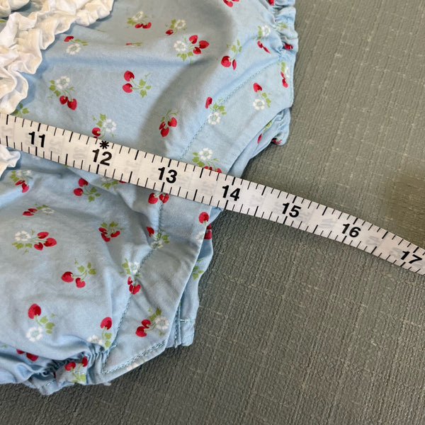 Janie and Jack Strawberry Ruffle One Piece Romper. Size tag removed, so please check measurements to ensure fit. (I think 3-6 months.) Adorable retro style sun suit outfit. Light blue with red strawberries and white ruffles. Snaps at the bottom for easy on/off.