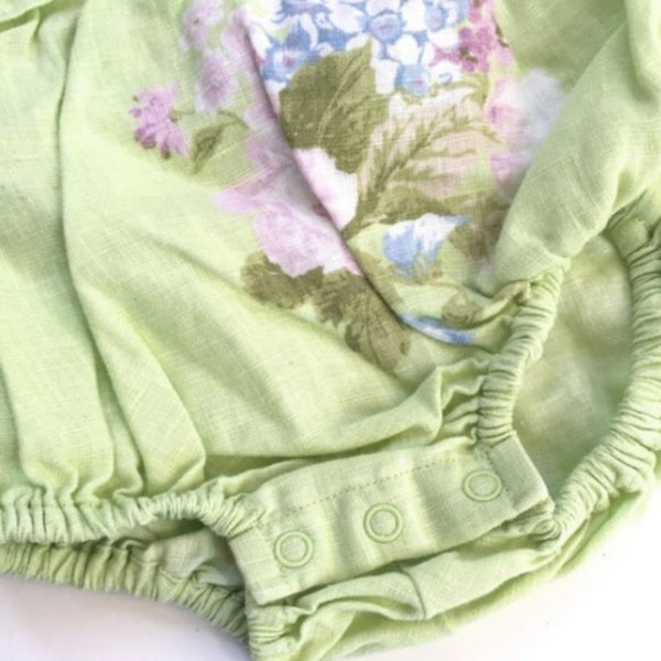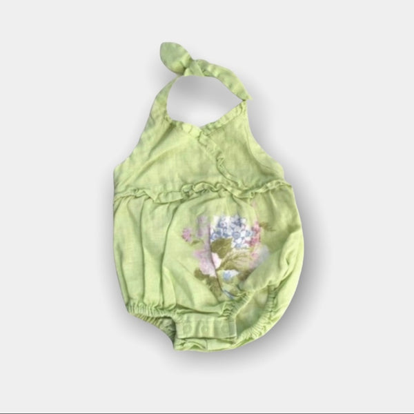 Janie & Jack Soft Green Linen Bubble Romper. Size 0-6 months. Dressy sunsuit features adjustable halter tie next and ruffles on the chest. Pretty floral design on belly. Pictures don't do this outfit justice. It's so adorable and in excellent condition!