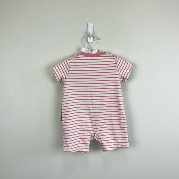 Mini Boden Applique Jersey Romper Rainbow Animals. Baby girl size 3-6 months. Cozy cotton one piece shortall outfit. Pink and white stripes with fun giraffe wearing a flower crown and a guinea pig holding an ice cream cone! Snaps on the shoulder and at the bottom for easy on/off.