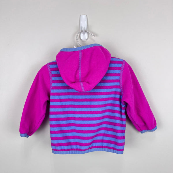 The North Face Girls Glacier Full Zip Hoodie. Baby girl size 3-6 months. Hooded, full zip fleece jacket. Pink and purple stripes. Light-weight, but cozy, durable, pill-resistant fleece. Has pockets! Perfect extra layer for fall or spring.