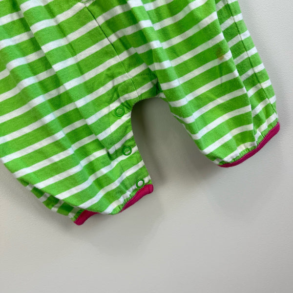 Vintage Gap Green Striped Jumpsuit Romper. Baby girl size small (3-6 months). Soft overalls in green and white stripes with pink trim and snaps down the center. Light marks on leg (see photo; untreated).