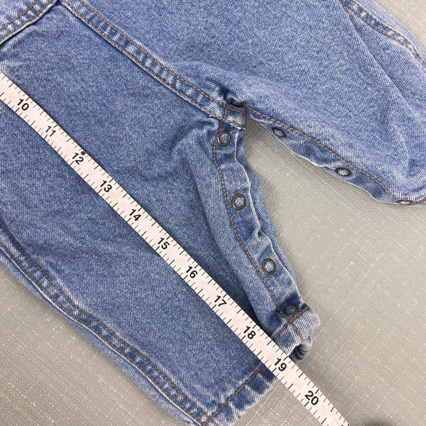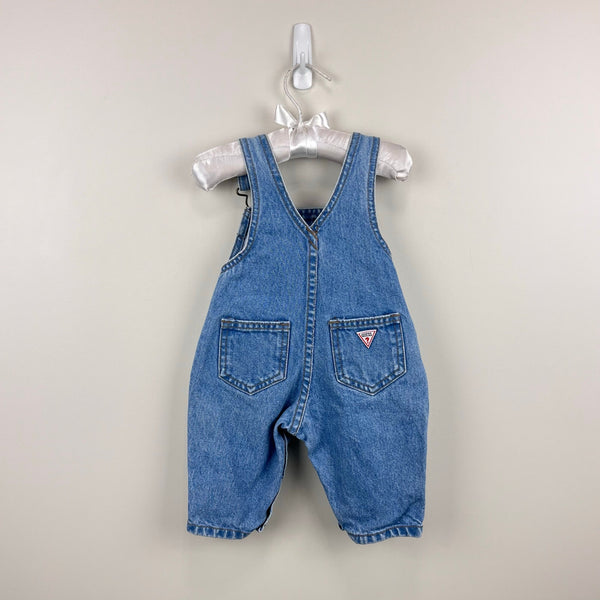 Vintage 90s Guess Blue Jean Overalls. Baby boy or girl size 6 months. A wardrobe staple! Classic denim overalls with adjustable straps and snaps along the legs. Signature triangle logo on the back pocket. Great condition with no flaws noted!