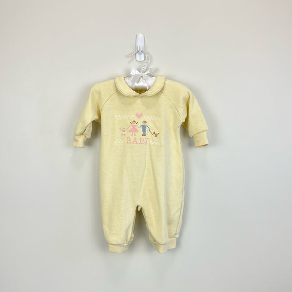 Vintage Healthex Yellow Baby Coverall. Baby girl size 6 months. USA made. Cozy one piece collared outfit with snaps in the back. Pink and blue cross-stitch style design on the chest. It doesn't get any cute than this!