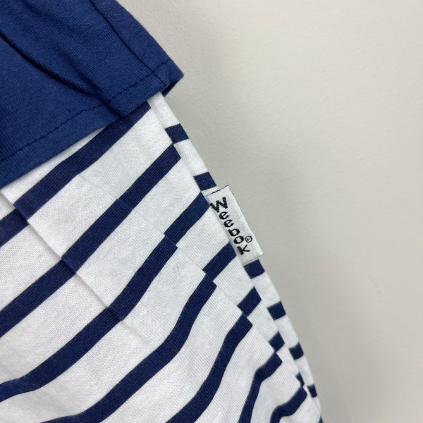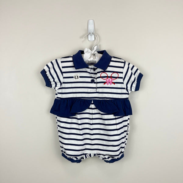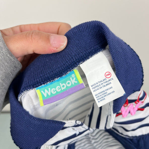Vintage Weebok Blue Striped Tennis Ruffle Romper. Baby girl size 3-6 months. Brand new without tag (NWOT). The cutest one piece shortall outfit! Navy blue and white stripes with ruffle around the waist. Collared with button placket and embroidered pink W and red tennis rackets on the chest. Snaps at the bottom.