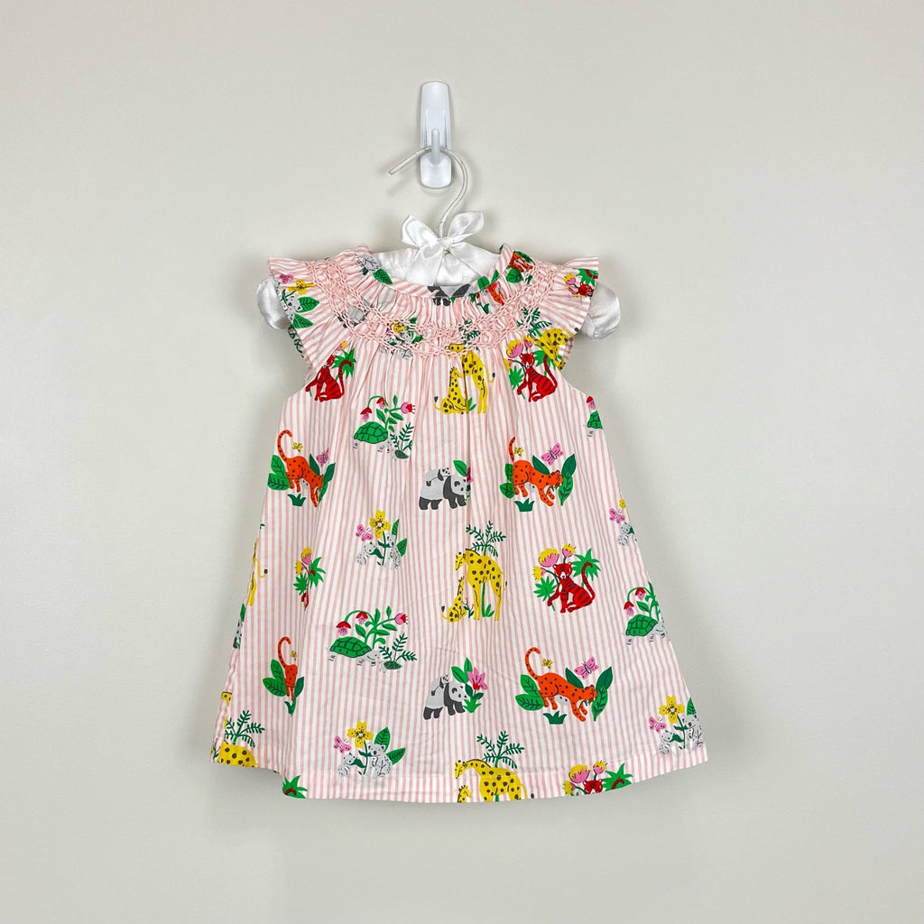 Mini Boden Stripy Smocked Dress in Boto Pink Jungle Print 3-6 Months NWOT