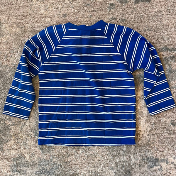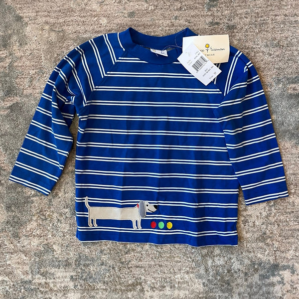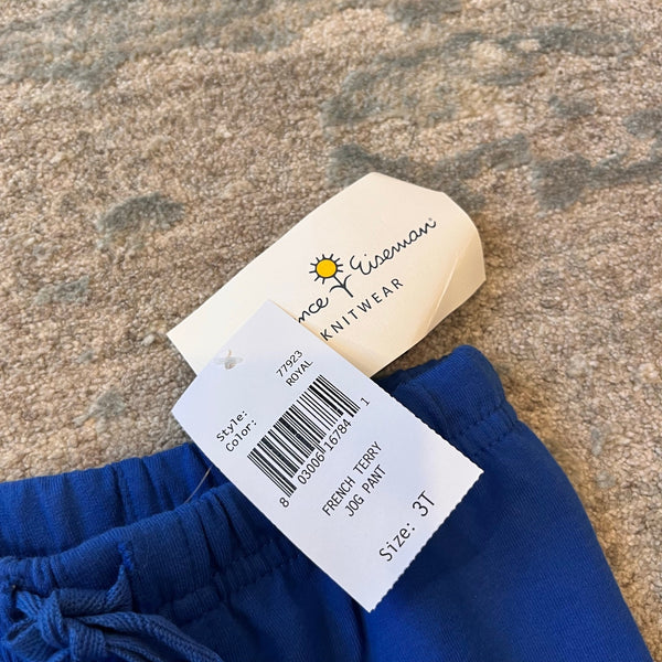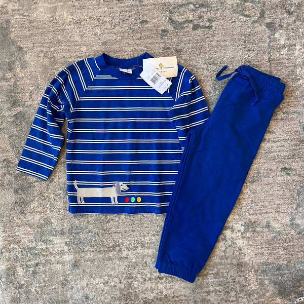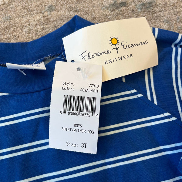 Florence Eiseman Knitwear Royal Blue Weiner Dog Shirt & French Terry Jog Pants Set. Toddler boy size 3T. Brand new with tags (NWT). Two piece outfit includes two separate pieces: Royal blue and white striped long sleeve top with applique dog and embroidered red, yellow, and green balls, and solid pull on sweatpants with elasticized cuffs and drawstring waist.