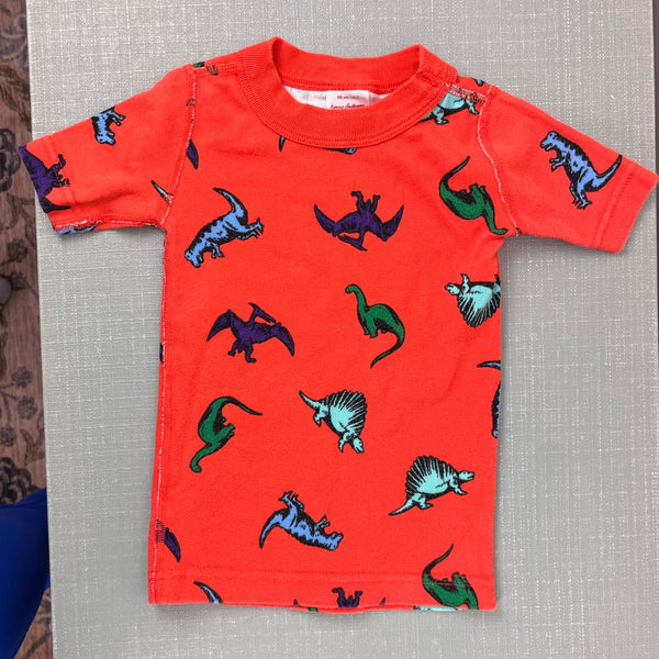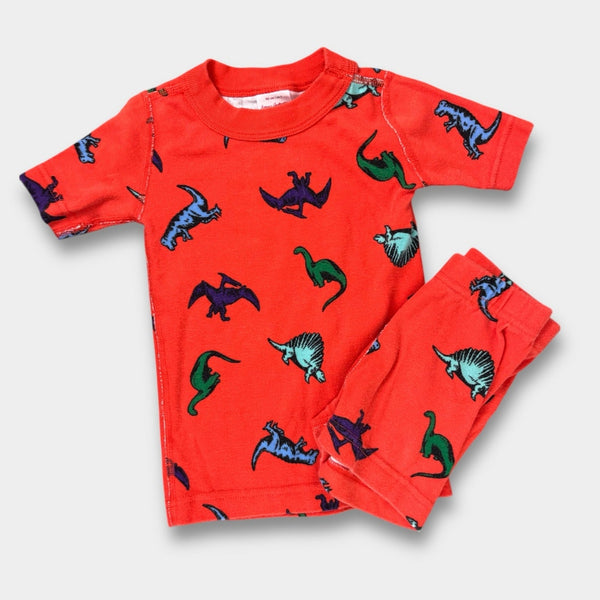 Hanna Andersson Orange Dinosaur Short John PJs. Toddler boy or girl size 90 cm (US 3T). Two piece pajama set includes short sleeve top and shorts bottom. Orange with fun dino print. Organic cotton. Great condition with light wear.