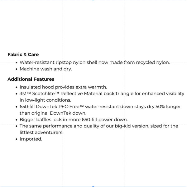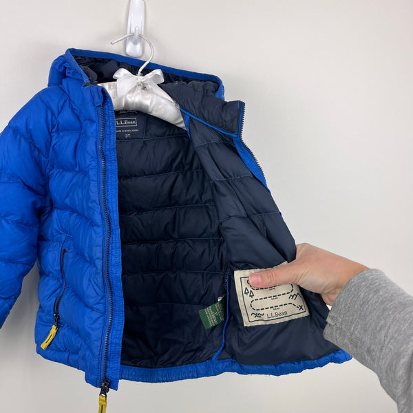 L.L. Bean Toddler Ultralight 650 Down Jacket. Toddler boy or girl size 3T. Lightweight, but warm down insulated winter coat. Deep saphire blue color. Features fixed hood, interior ID label, reflective patch on back, and water resistant nylon exterior. Has a small scuff on the front and the reflective patch on the back is partially torn off (I think a relatively easy fix if you sew, but I don't!) Perfect for keeping at preschool! See photos for more details. Retail $120.