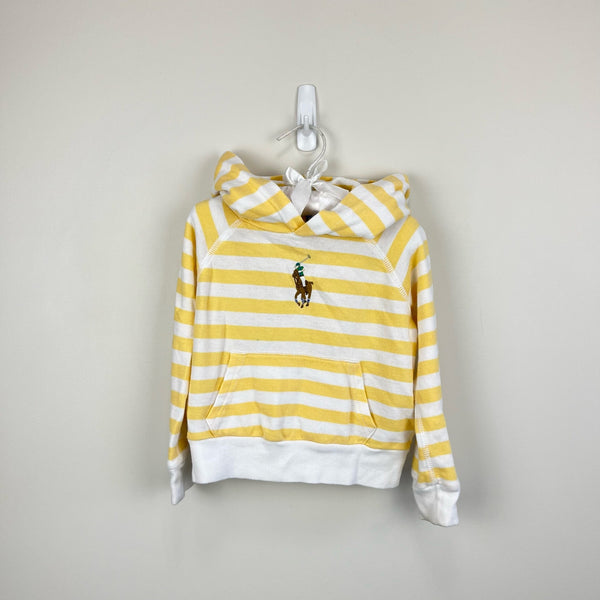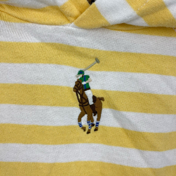 Ralph Lauren Kids Striped Cotton Hoodie Empire Yellow. Toddler girl or boy size 3T. Soft cotton jersey pullover sweatshirt. Kangaroo pocket and hood. Signature embroidered large polo player logo on the chest. Tiny marks (see last photo; untreated).