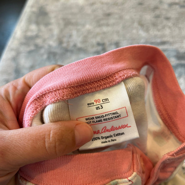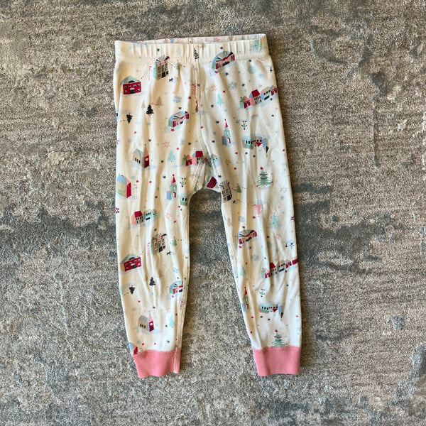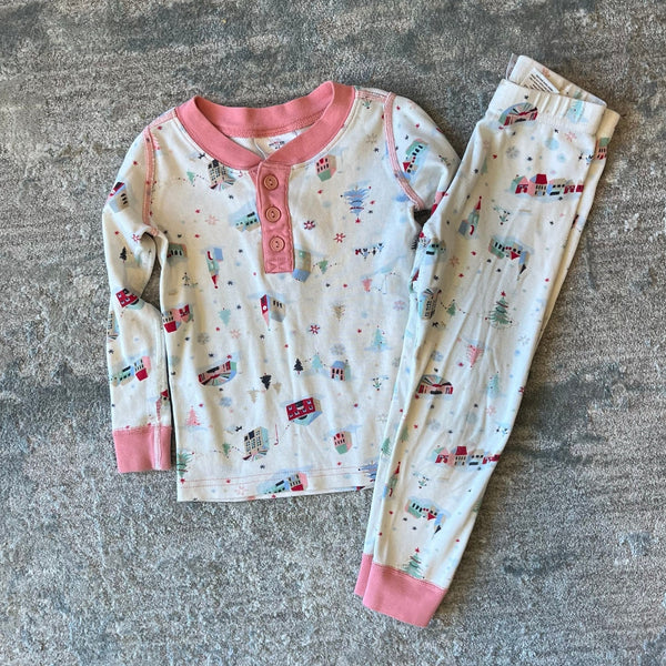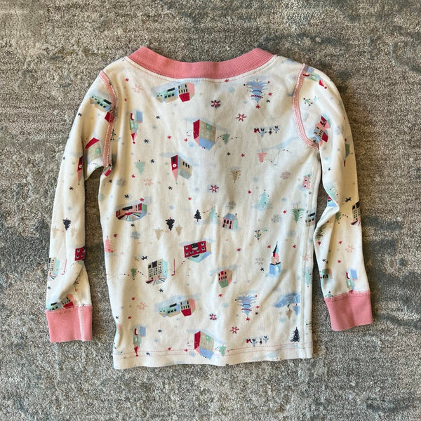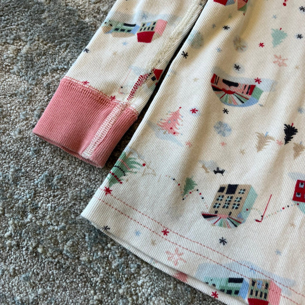 Hanna Andersson Christmas Town Long John PJs. Toddler girl size 90 cm (US 3T). Two piece pajama set with long sleeve top and pants bottom. Ivory with light pink trim. Button placket. Adorable snowy winter day scene in a village - trees, houses, and people.