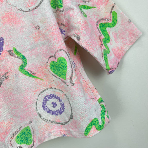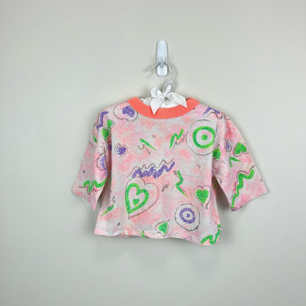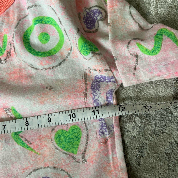 Vintage Girls Scribble Glitter T-Shirt. Toddler girl size 3T. USA made. Fun short sleeve printed top in peach pink, purple, neon orange, green, and silver. Mixed print with hearts and other doodles.